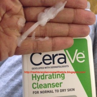 First lets look into the facial cleanser that i use.I use the 'Cerave hydrating cleanser' for Normal to dry skin.It has 12 Fl Oz of product and retails for $ 8.09 at my local walmart.It comes with a pump which i feel is very sanitary and easy to use.It has a milky white gel like consistency and on mixing it with water it does not lather up.